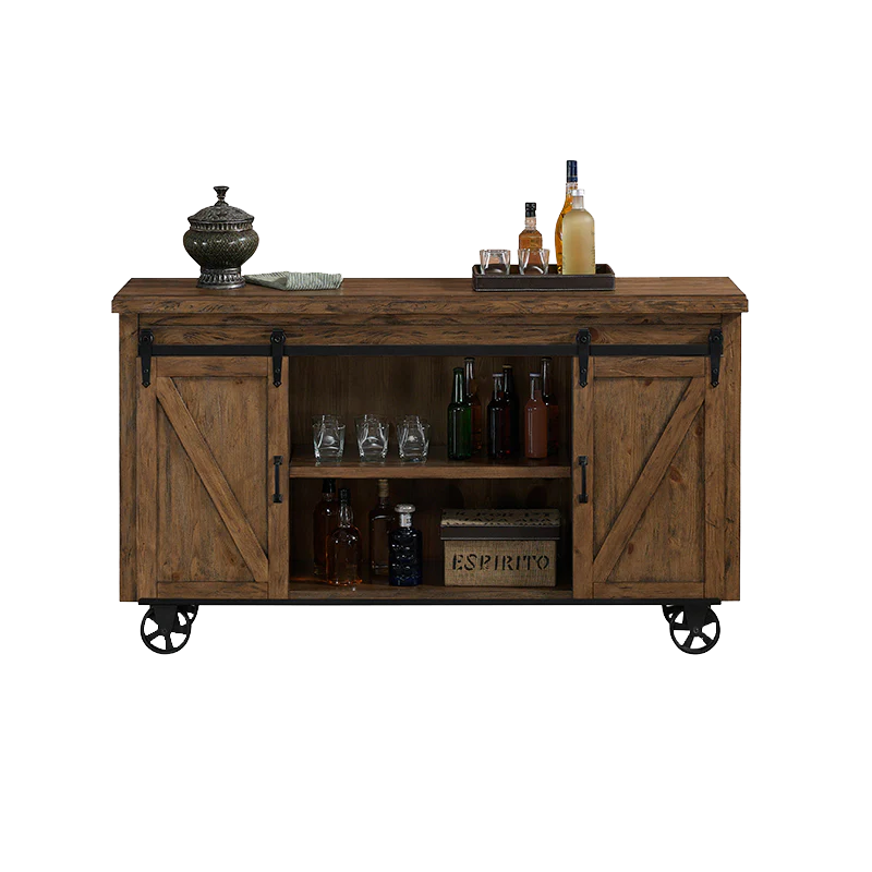 The Bristol Bar Cart, made of pine, is the perfect accent piece to any home looking for a fun eating or drinking companion! Its industrial design and sliding barn doors allow it to take on multiple looks while providing excellent functionality and plenty of storage space. It even has a hole underneath the middle shelving unit for any cords so it can be used as an entertainment stand. Never party without it!