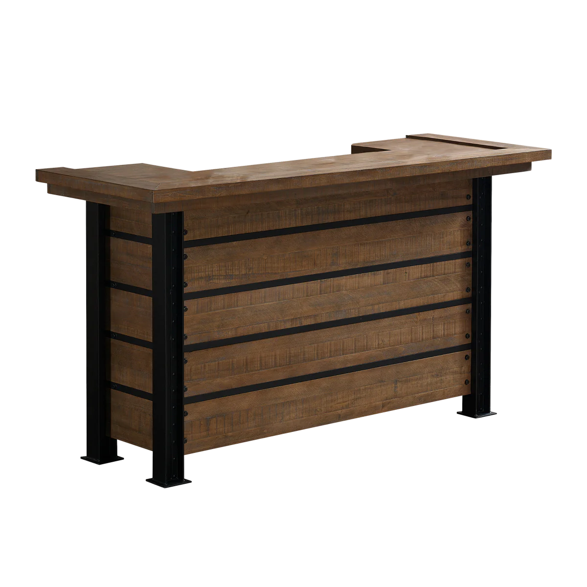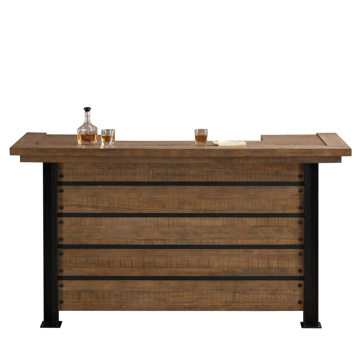 The Industrial Gateway Bar is constructed out of reclaimed wood with metal accent hardware and includes a stone cutting surface, an ice bucket, and ample storage shelving, making it the perfect marriage of industrial looks with new-age functionality.