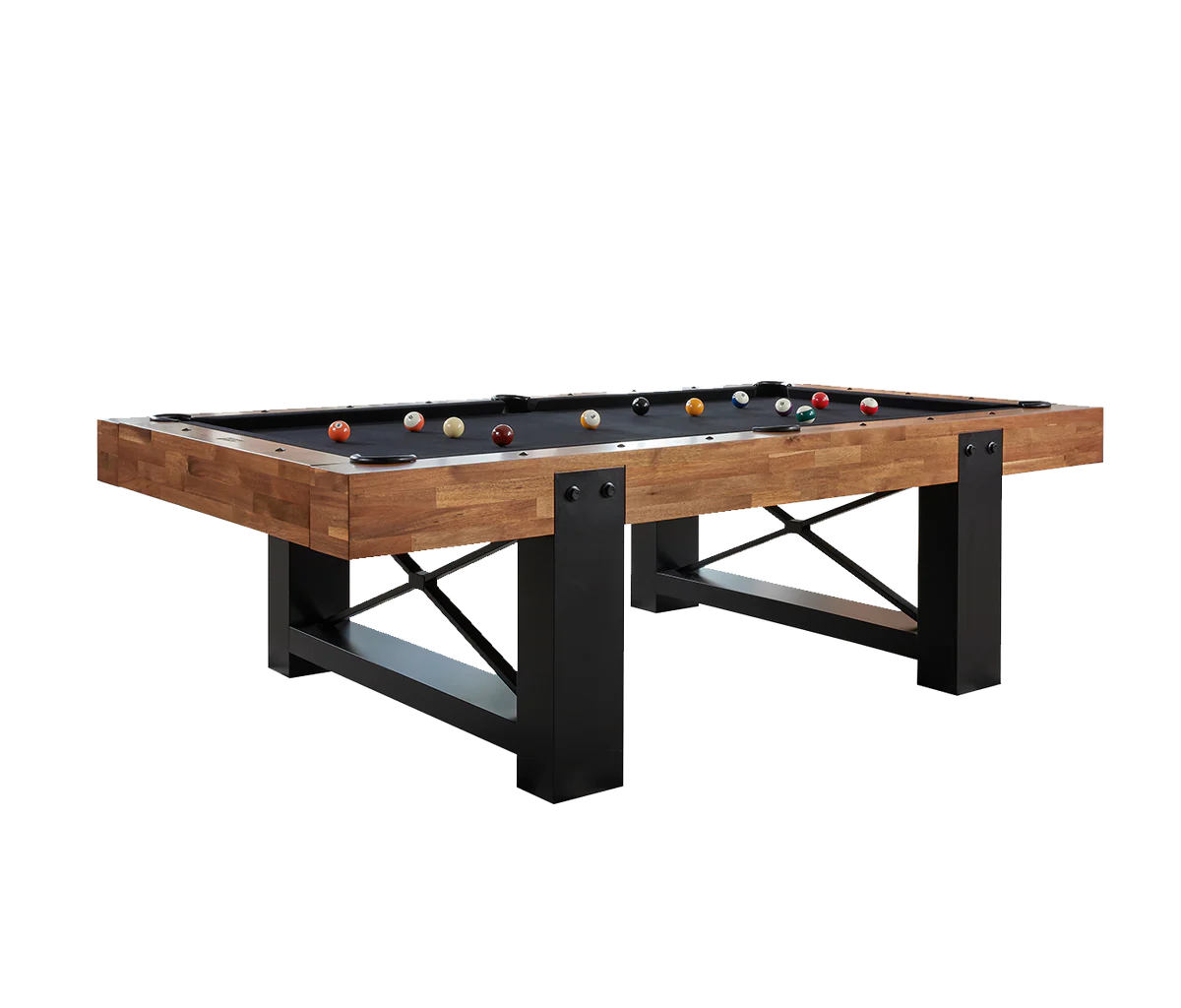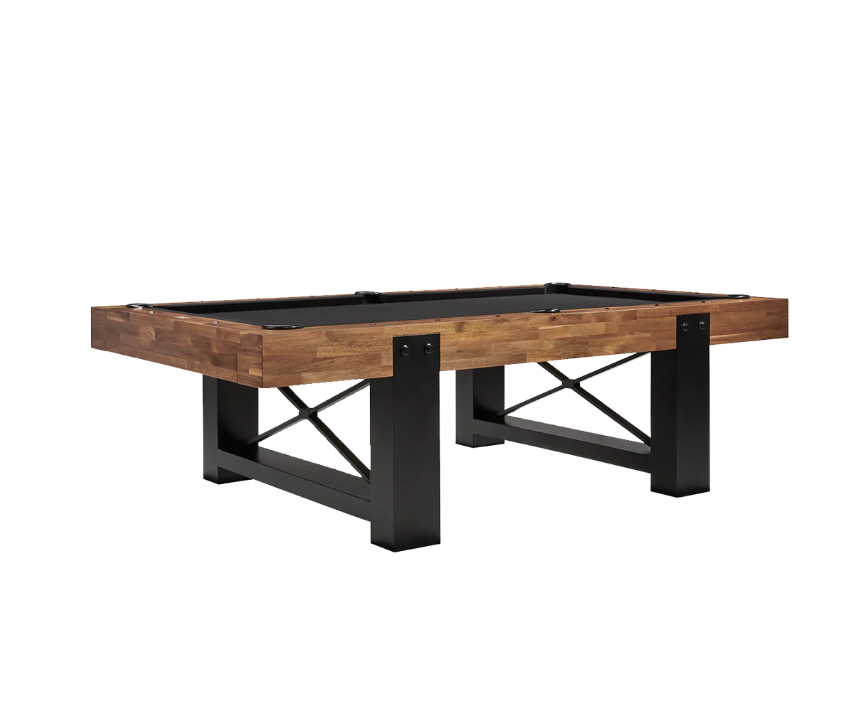 The Knoxville 8ft puts a new spin on modern, rustic industrial design. The warm Acacia finish combined with rough, matte black exposed hardware brings a lived in, urban overtone. Pair this billiard table with a dining conversion top for ultimate entertaining. This pool table features matte black pyramid clavo metal rail sights, robust construction, and internal drop pockets.