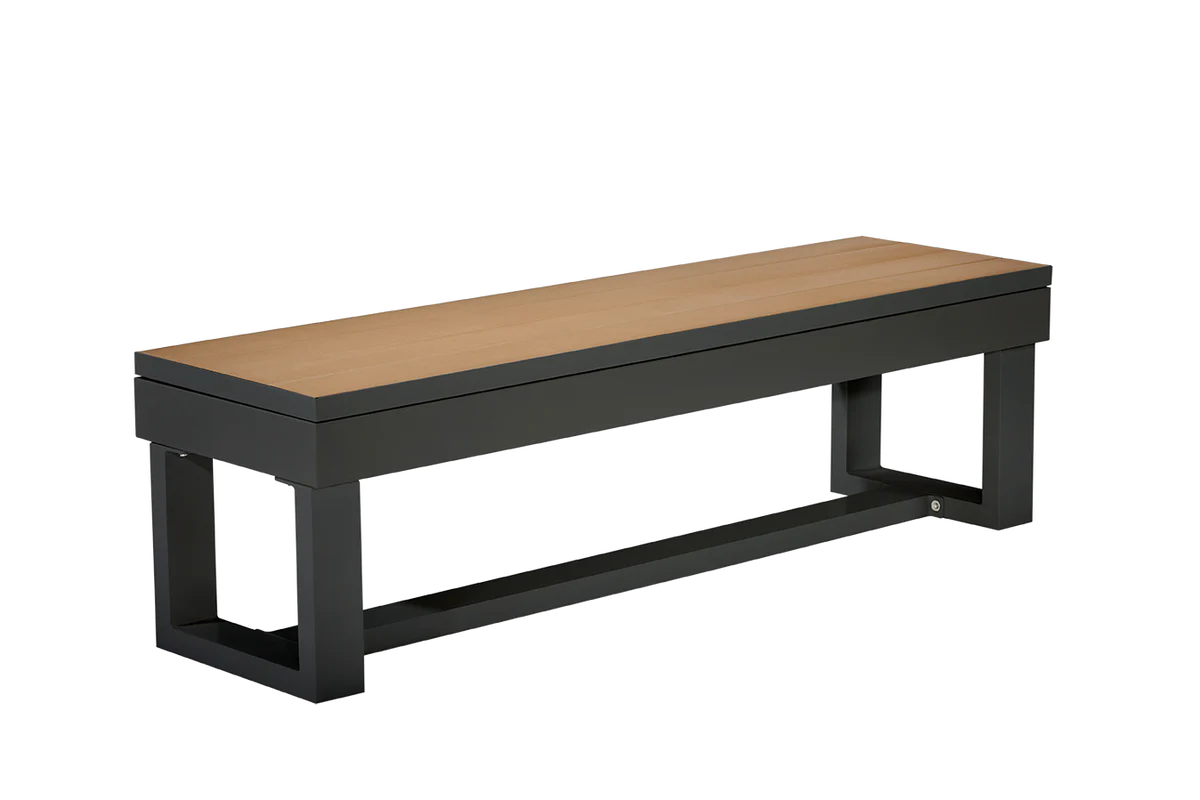 The Lanai Outdoor Bench is designed to pair with the Lanai Outdoor Pool Table. Crafted from furniture-grade wood composite material, this modern set combines durability with a sleek aesthetic. With its contemporary style, it fits perfectly with any backyard setting. Dimensions: 62”L x 18”D x 18”H