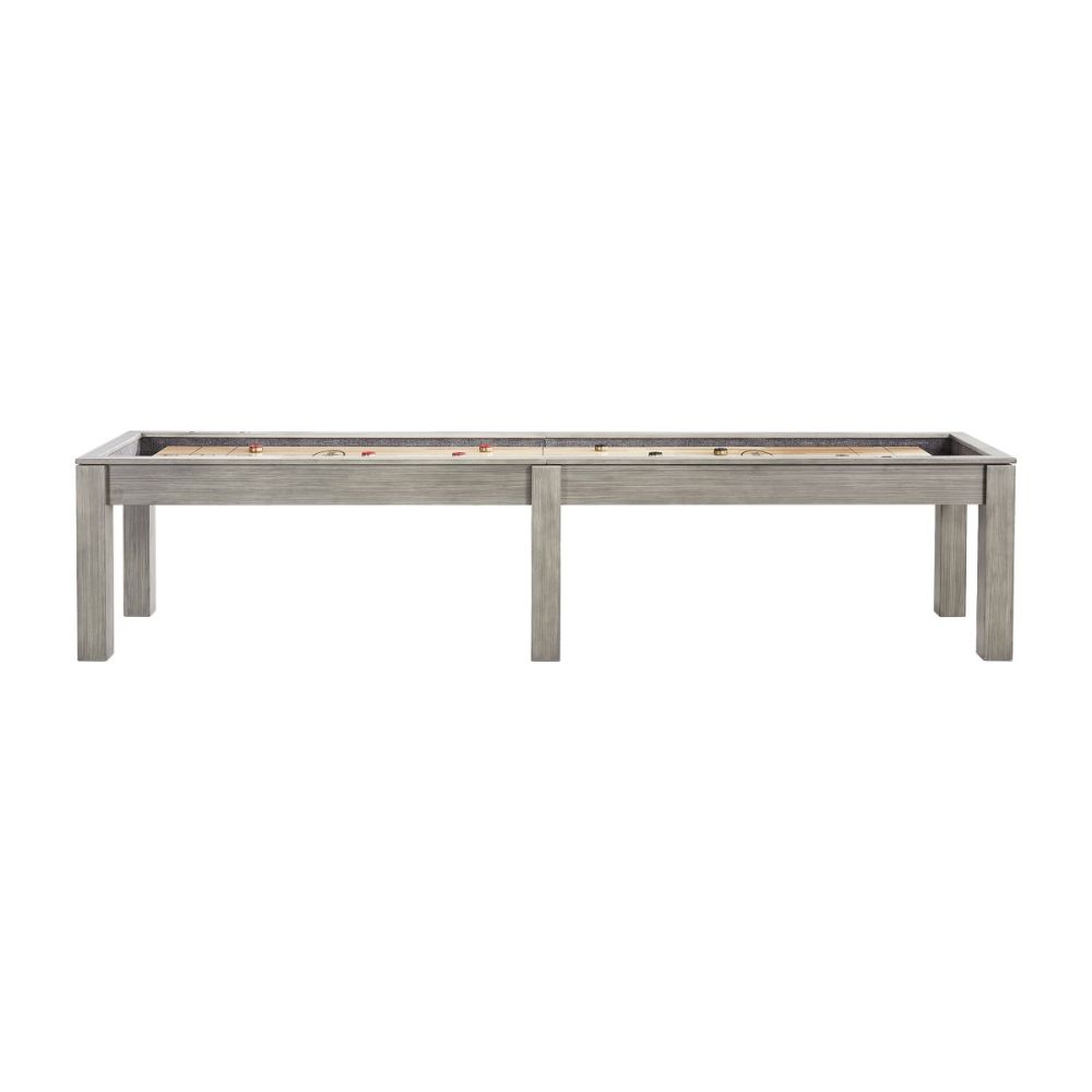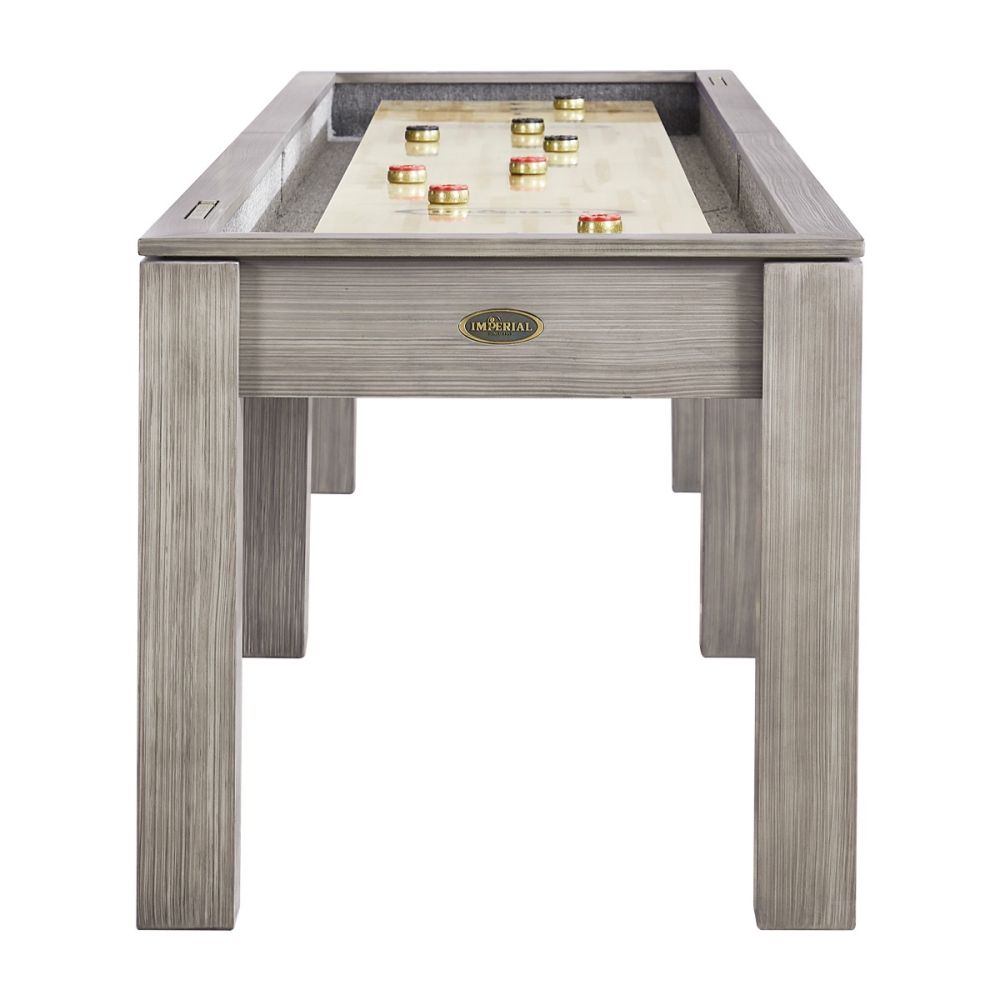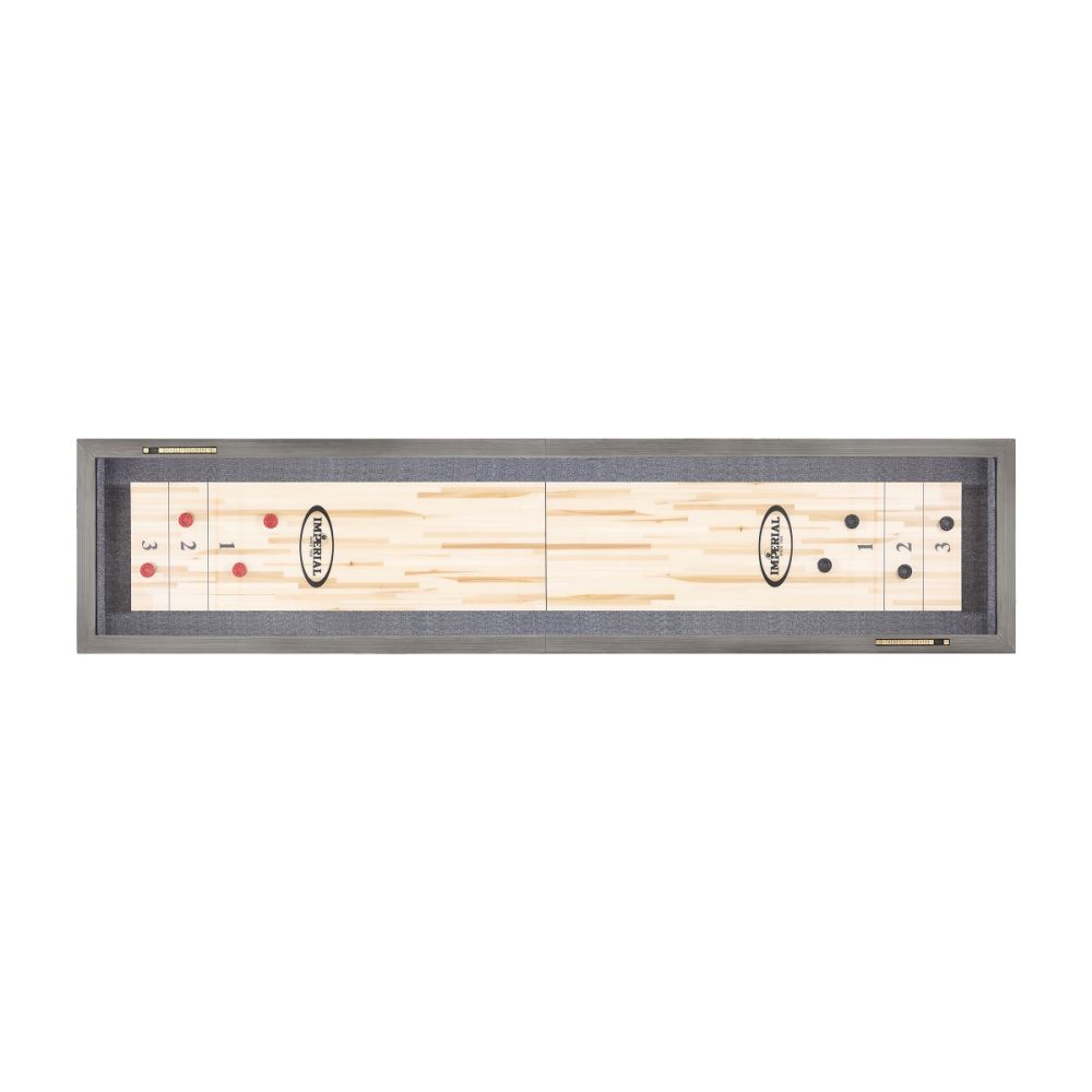 The Imperial Penelope 12ft Shuffleboard Table is an authentic pub-style table. Made of solid wood with our Silver Mist or Whiskey finish. The table has a 1.7" (44mm) solid wood playing surface to provide a great puck slide. Solid wood post legs provide clean lines and a modern look and add stability. Includes 4 red and 4 blue shuffle pucks, inlaid scoring markers, a can of powder, and a playfield brush. Great fun for the entire family!