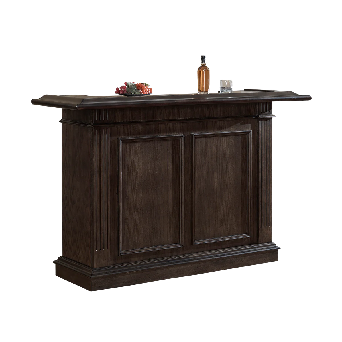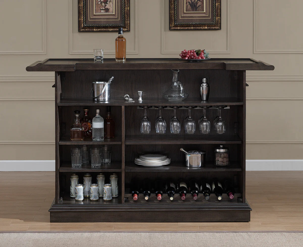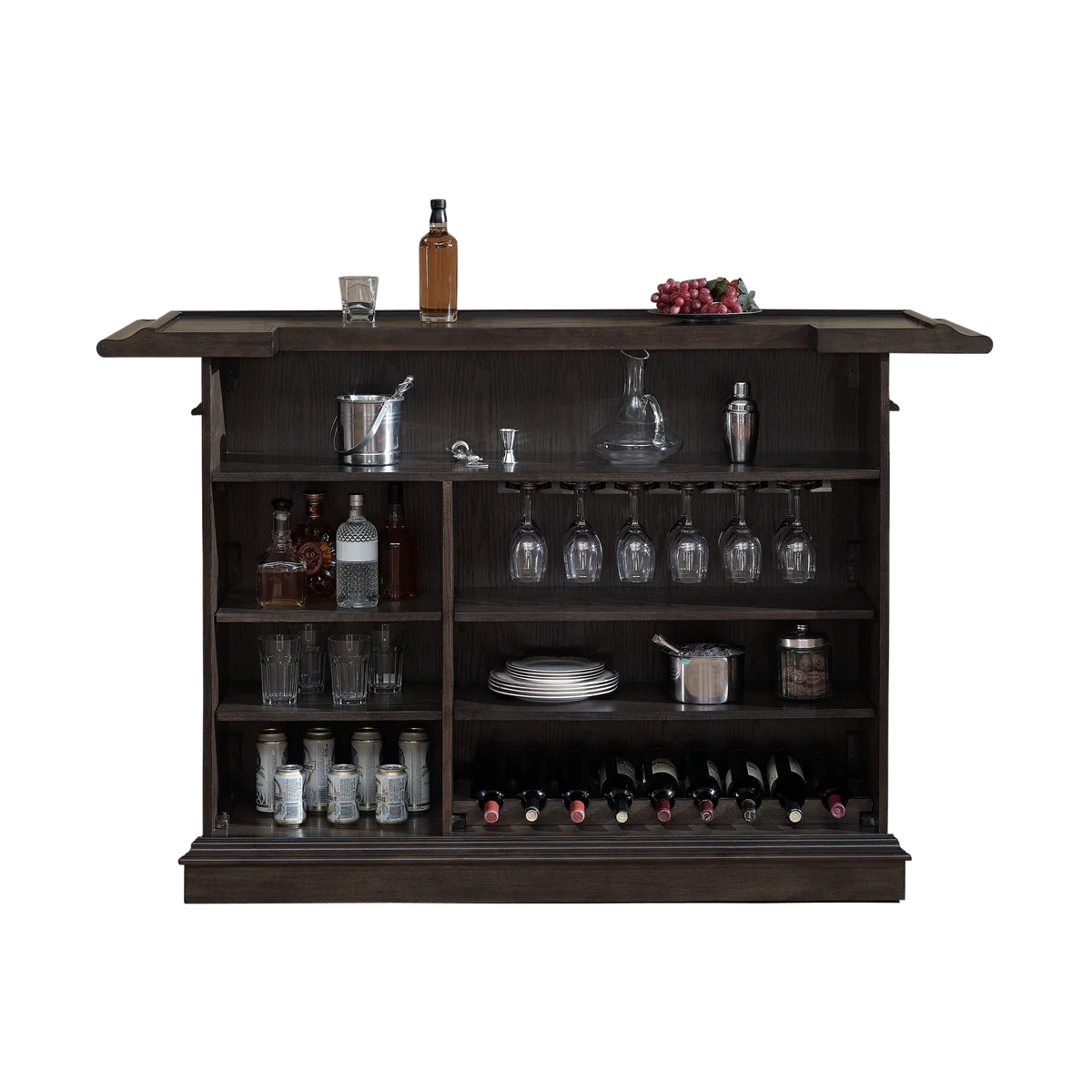 Finished in Riverbank, this stylish 70” home bar features glass stemware holders, wine racks, and plenty of storage shelving. With lots of storage space, decorative panels and molding, it's sure to be appreciated for its form and beauty.